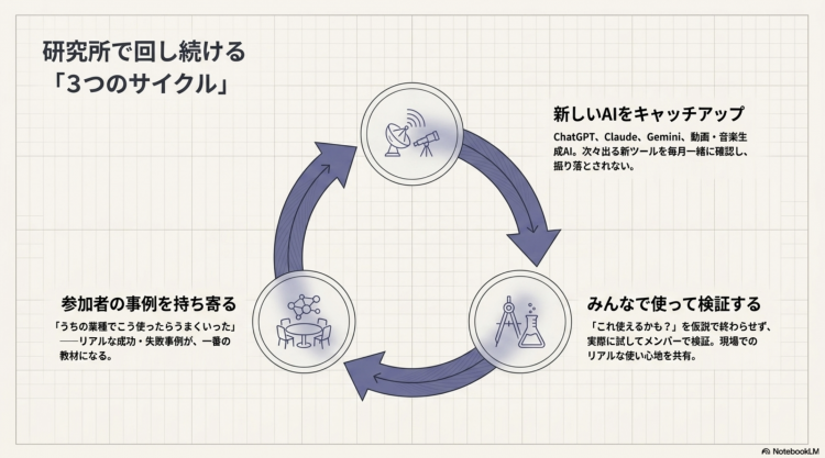 ChatGPT、Claude、Gemini、動画生成AI、音楽生成AIなどなど……次々出てくる新ツールを毎月一緒に確認して、振り落とされないようにする。